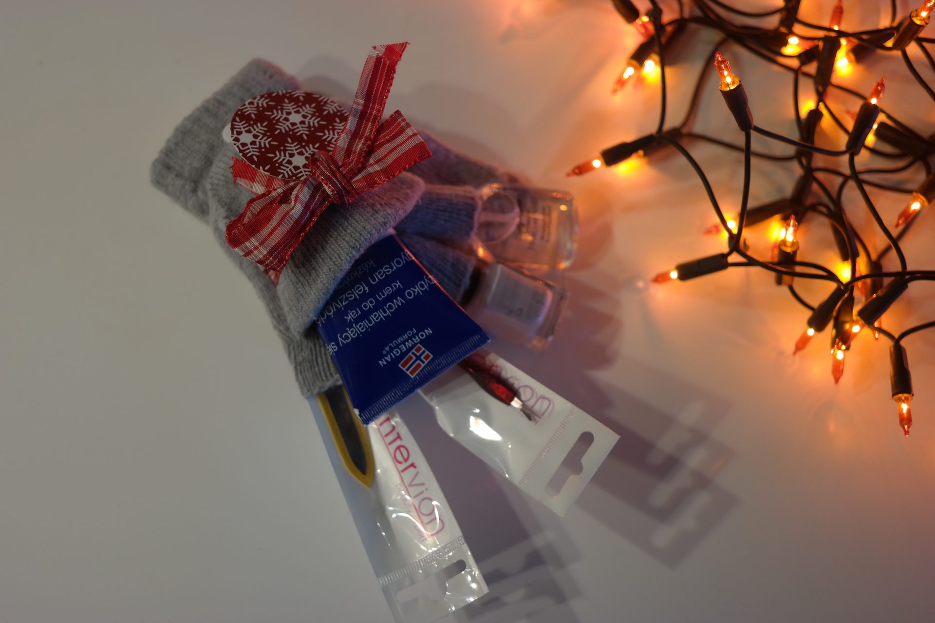 Potrzebne nam będą: świąteczna wstążka, rękawiczki z odkrytymi palcami, krem do rąk, pilnik, lakier, odżywka do paznokci itp.