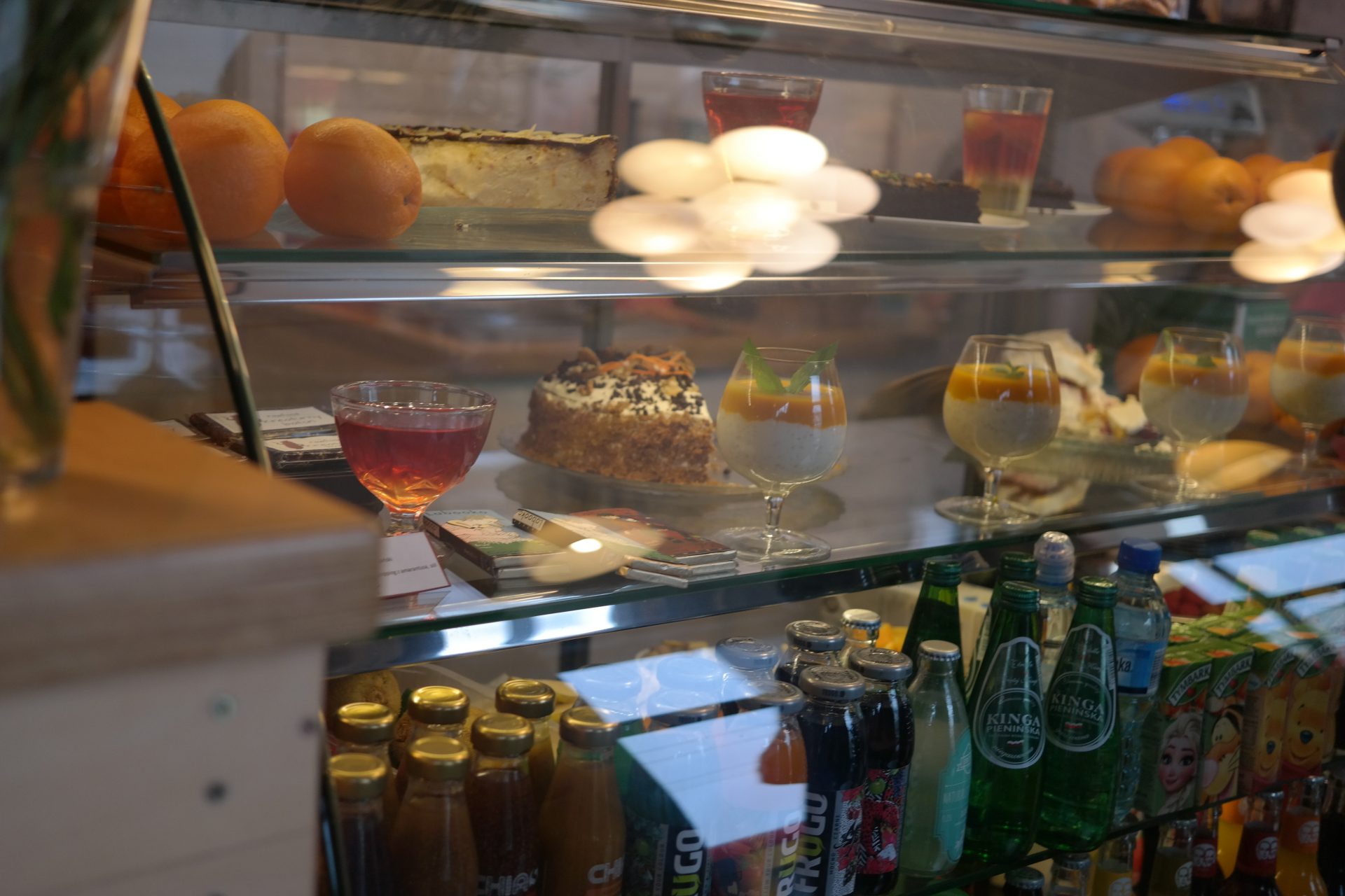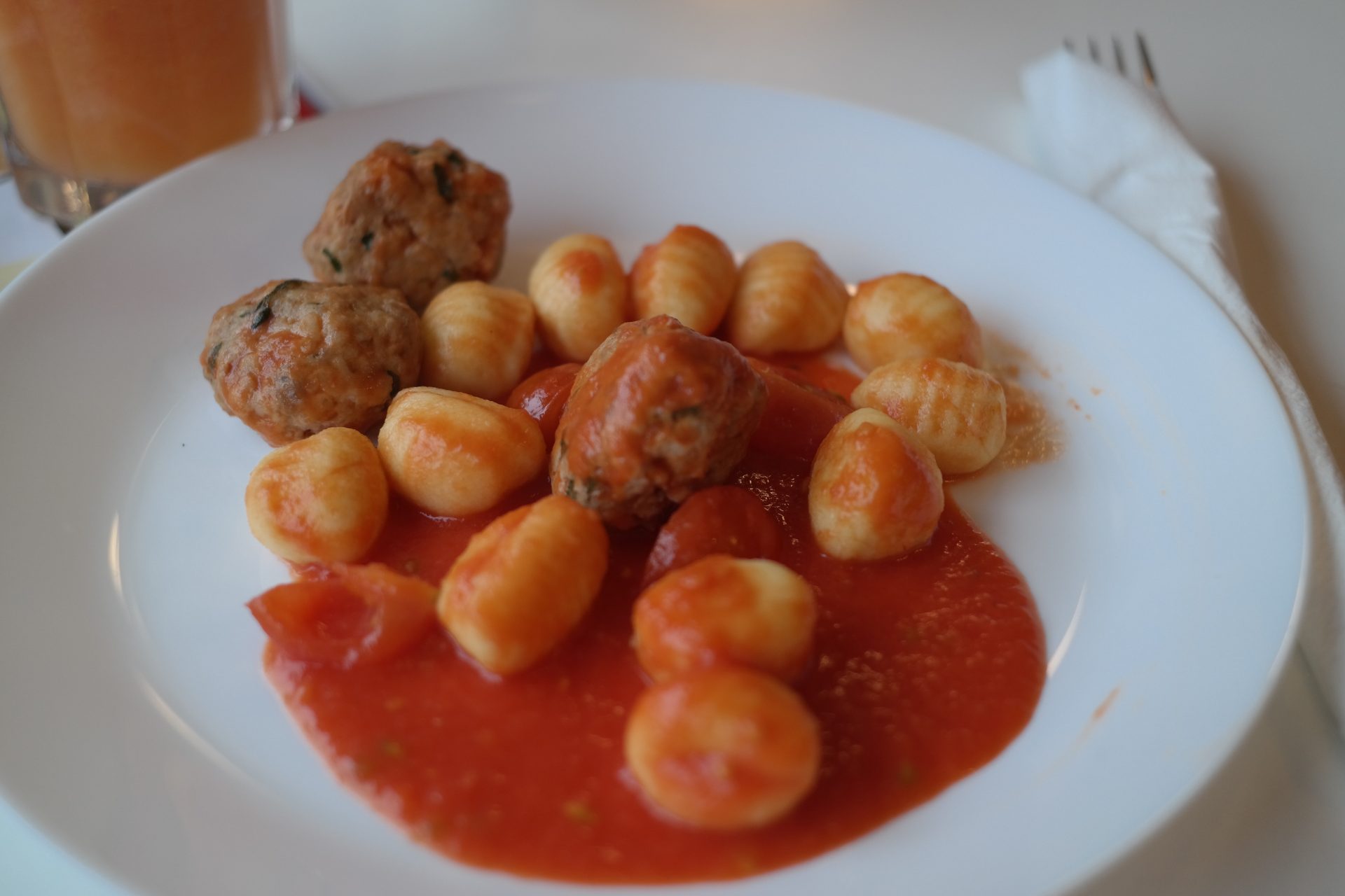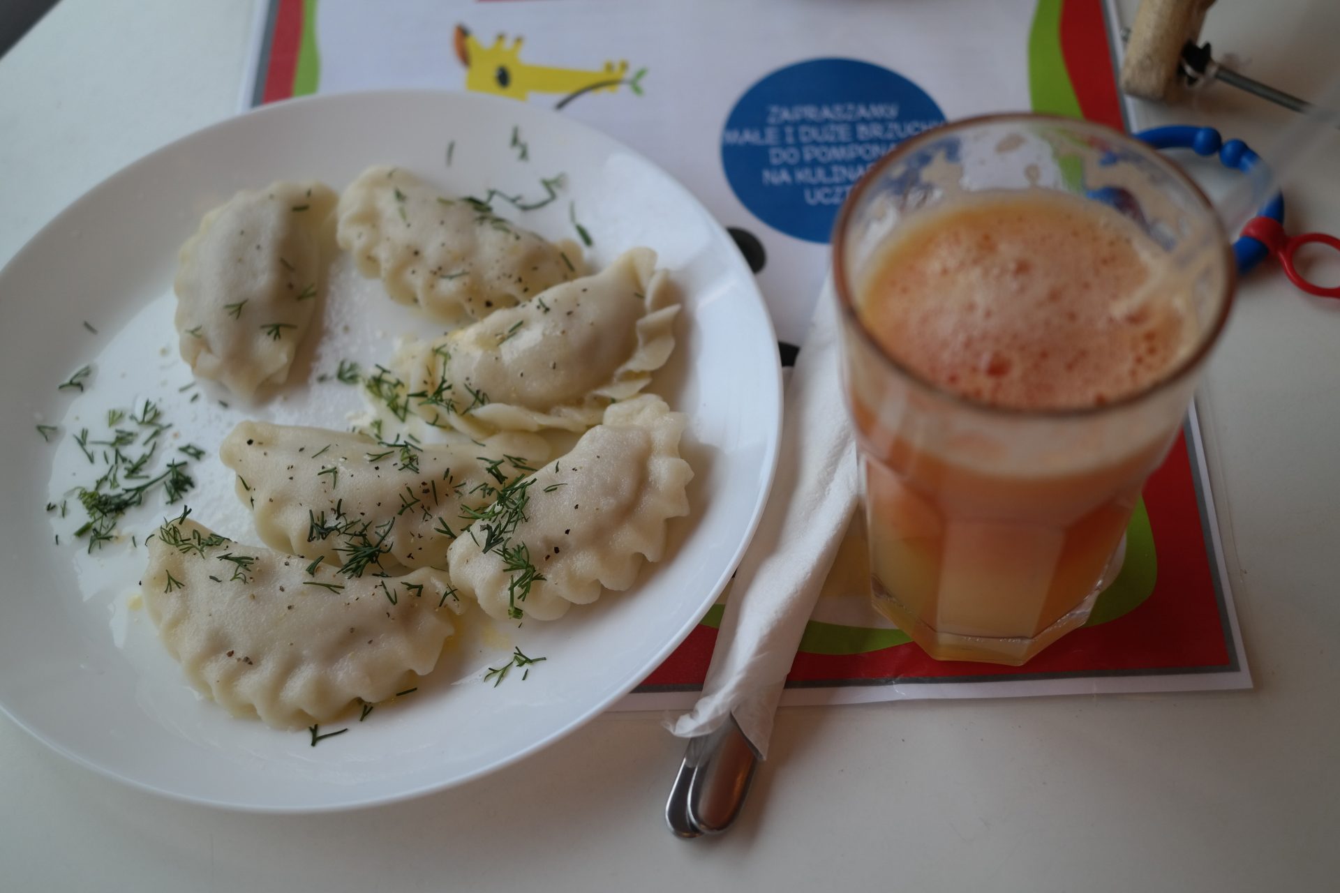 Wypicie ciepłej kawy czy zjedzenie dobrego obiadu – tak to możliwe właśnie w Pomponie 🙂 Cieszy mnie fakt, że jedzenie jest zdrowe, eko, tak jak lubię najbardziej 🙂 Dla zupełnie małych dzieci mamy mogą zakupić słoiczki i poprosić o podgrzanie. Nie obawiałam się zamówić Jaśkowi gnocchi z pulpecikami drobiowymi w pomidorowym sosie. Zjadł prawie całą porcję, więc nie było najgorsze. Moje pierożki też były pyszne i też nadawały się do podziału z malcem. Dałam mu tylko kawałeczek na smaka, bo zamiast się bawić, poszedłby spać z przejedzenia 🙂
